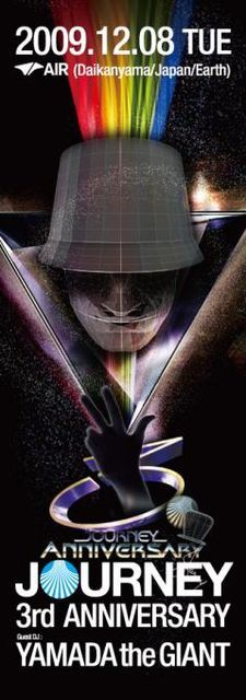 管理人様、告知失礼いたします。 --- JOURNEY -from Earth to Space- 3rd ANNIVERSARY!!! 2009.12.8 TUE at AIR(Daikanyma/Japan/Earth) Open : 22:00〜 Genre : HOUSE / TECHNO Charge : Door 2500yen/1D w/Flyer 2000yen/1D AIR Members 2000yen/1D ※メッセージをいただければディスカウントお取りします。 DJs Guest DJ:YAMADA the GIANT(LIVErary/Pureself) http://yamadathegiant.com/ Main Floor: HONGA, HASHIMONN, HIT-4, FRISKIE, BUCCHO Lounge: SAKAMAKI TADAHIKO, MIJAT, KATSUOKA, KITABATAKE VJs: GEA