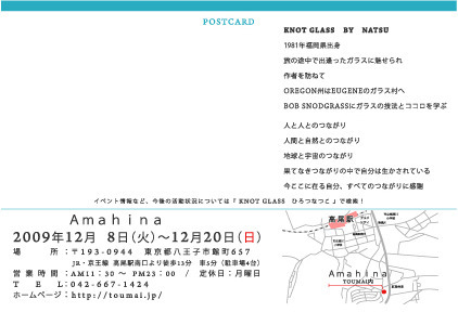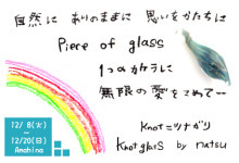 繋がりが繋がりを招き、遠く沖縄より、 美しくも強い、ガラスの作品達が高尾を彩ります。 冬の空気の冷たい透明感を持つペンダント。 一つひとつが個性的な表情を持つ香水ビン。 大切な方へ贈りたいガラスのペン。。。。。 クリスマス目前のこの時期に、スノーフレーク より一足早い、ガラスの結晶のプレゼント。。。 <KNOT GLASS>廣津なつこ 1981年 福岡県生まれ 2007年 単身渡米 オレゴン州ユージーンという小さな町の ガラス村で、BOB SNODGRASSに師事し、 ガラスの技法とコ