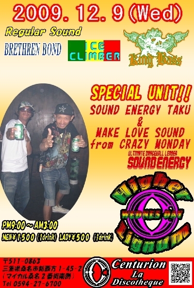 Higher Lignum wednesday vol.9 -Higher & Centurion presents- 2009/12/9(水) 毎月第2水曜日開催!!! ■年末SPECIAL Guest sound≫ SOUND ENERGY TAKU & MAKE LOVE SOUND (from CRAZY MONDAY) ■Reguler sound≫ KING BASS / ICE CLIMBER ■Support Sound≫ madder nise ■Floor Vibz≫ Yo-taro / Gonzo / Higher / and more ■VIDEO 撮影あり (YouTubeでUP中) 9pm-3am MEN:\1500-1d LADIES:\500-1d [問] aya-higher525@hotmail.co.jp CENTURION (マイカル桑名内) 桑名市新西方1-45-2 TEL:0594-