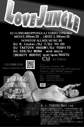 CLUBBEANS PRESENT LOVE JUNGLE 前回大好評だったJASON's NIGHTは第2金曜日、 新たにレギュラーイベント、「LOVE JUNGLE」と 生まれ変わり、六本木のお洒落箱a.i TOKYOで開催決定!!! Xmas目前で恋人のいないアナタ!そろそろ恋活しちゃいなよ! All mixでJASON's DJ達が音楽で盛り上げます!!! TOKYO遊人達よ! この愛(A.I)の森でターザン&アマゾネスになれ!!!!! CLUBBEANS PRESENTS LOVE JUNGLE@A.I TOKYO ★DJ K.INUKAI/T/YO-CO/TATSUYA HASUMI/326/YOSHITO/MONA and more... ★BEAUTY BOOT
