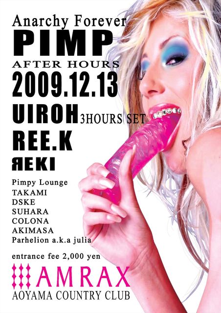 2006年より始動した東京を代表するテクノアフターパーティー”PIMP”。 今や伝説となった青山のMANIAC LOVEからの流れをくむ 唯一のテクノアフターパーティーとして多くのフリークス達に愛されたPIMPは、 12月をもちまして一旦終了致します。 4年分の、皆さんと迎えた最高にCOOLな朝に感謝を捧げ ラストにはアンダーグラウンドの女王REE.Kをゲストに レジデントのUIROHのロングセットで、 最後までPIMPらしい朝をお届け致します。 皆様お誘い合わせの上、踊りやすい恰好でお越しくださいw