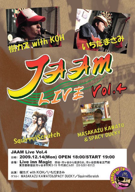 JAAM公認ライブVol.4が決定いたしました 日時:2009.12.14(Mon) OPEN 18:00/START 19:00 料金:1,500円(1ドリンク別) 会場:Live inn Magic 四谷・市ヶ谷から徒歩5分。市ヶ谷防衛省正門前 東京都新宿区市ヶ谷本村町3-19 千代田ビルB1 (03-5261-8312) 出演:樹カズ with KOH/いちだまさみ ゲスト:MASAKAZU KAWATO&SPACY DUCKY/SquirrelScratch チケットの取扱は、北海茶屋 殿までお願いします http://mixi.jp/view_community.pl?id=1373221