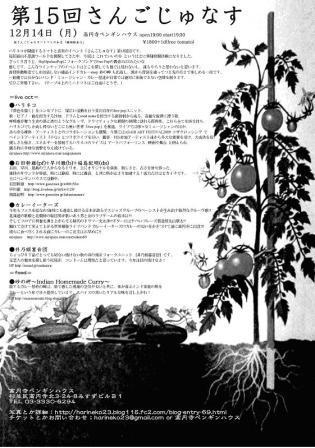 管理人様、告知を失礼致します ハリネコのVo&Pf沙知です。 井乃頭蓄音団が出演するライブのお知らせです★ ハリネコが主催するトマトと音楽と美味しさを感じられるイベント「さんごじゅなす」に井乃頭蓄音団が初出演いたします! 今回は多彩なゲストを迎えたアコースティック編成とのこと! 実は私も2曲ほどピアノ&コーラスで参加いたします。よろしくお願いいたします! ほんとに何処にも無い、何処でもやらない一夜です! 少なからず、何かを感じてびっくりしていただけると思います。 出演はコチラ! フリ