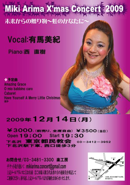 ココロコファンの皆様、私事で恐縮ですが、初なものですから、是非是非宣伝させてくださいませお願いいたします 緊急告知!MIKIソロコンサートのお知らせ!!! みなさ〜〜ん!念願のソロコンサート12月14日に決定いたしました! 場所は、下北沢にある、東京都民教会!チャペルに響く私の願いを是非聴きに来てください!!! MIKI ARIMA X'mas Concert 2009 未来からの贈り物〜虹のかなたに〜 Vocal: 有馬美紀 Piano:西直樹 予定曲 アメージンググレース