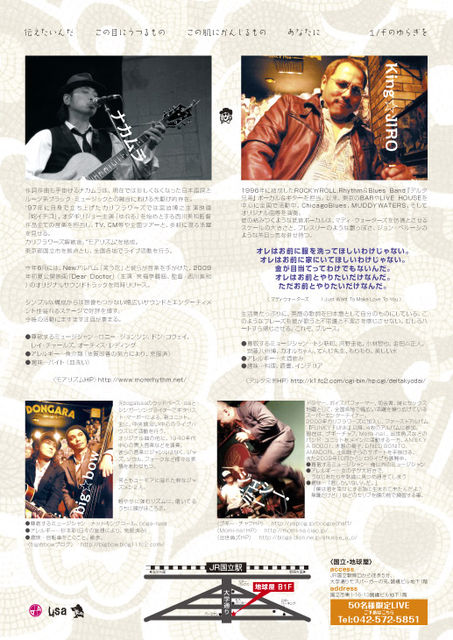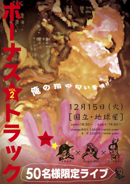 来たる12月15日(火) 今年も国立にて 『ボーナス☆トラックVOL.2』を開催することになりました。 今回は忘年会なのでゆるめな感じで なので・・・告知をあまりしていません(笑) 〜〜〜〜〜〜〜〜〜〜〜〜〜〜〜〜〜〜〜〜〜〜〜〜〜〜〜〜〜〜 12月15日(火) 『ボーナス☆トラックVOL.2』 〜俺の指のにおいを嗅げ!!50名様限定ライブ〜 前売り:1500円+1ドリンクorder 当日:2000円+1ドリンクorder 場所:『国立地球屋』Tel : 042-572-5851 JR国立駅南口から徒歩5分 大学通りモスバーガーの