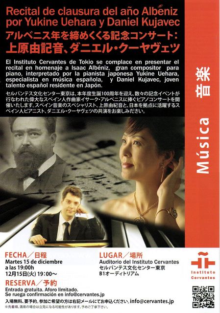 こんにちは。セルバンテス文化センターのお知らせをそのまま貼り付けます。 宜しくお願いします。 _______________________________________ アルベニス年を締めくくる記念コンサート 上原由記音、ダニエル・クーヤヴェツ 生誕100周年で数々の催しが行なわれたアルベニス・イヤーを締めくくるコンサート。スペイン音楽のスペシャリスト上原由記音と、日本を拠点に活躍するスペイン人ピアニスト、ダニエル・クーヤヴェツの共演。 日程:12月15日(火)19:00〜 場所:セルバンテス文化センターオーディトリアム 予約:入場無料。要予約。i