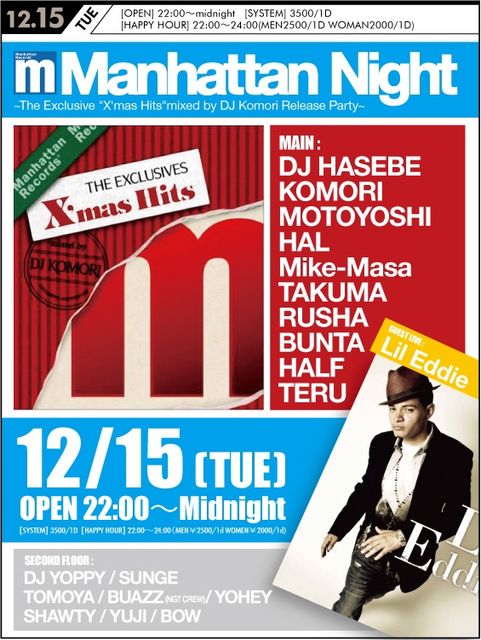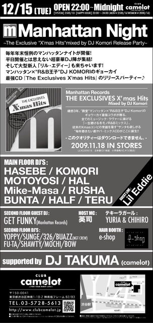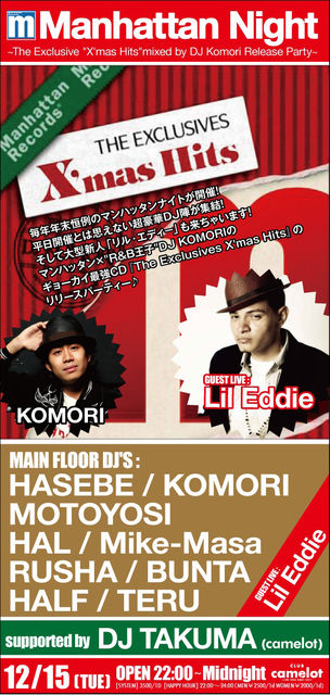 管理人様告知失礼致します! 12月15日水曜日はMANHATTAN RECORDSがお送りする『MANHATTAN NIGHT』の日です 前回は代官山AIRにて行われましたが今回はCAMELOTでの開催になります 今回もDJはHASEBE、リリースパーティをかねているDJ KOMORI、DJMOTOYOSI、DJHALなど毎回豪華すぎるメンツで行われてます 今回もCDをリリースしたばかりのLil EddieがDJ KOMORIのFeaturingアーティストとしてスペシャルなライブも行います 豪華でレアなMANHATTAN RECORDSだからできるスペシャルなパーティ、是非是非遊びに来てみて