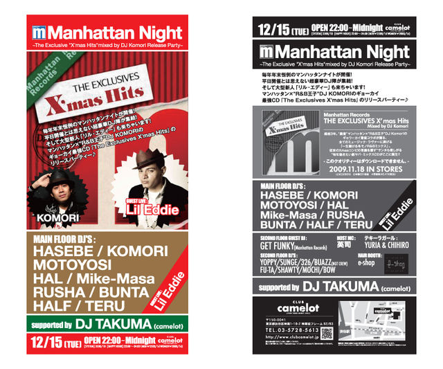 管理人様、告知失礼致します。 ━★Manhattan Night★━ 毎年年末恒例のマンハッタンナイトが開催! 平日の開催ながら、週末よりも超豪華なDJ陣がCAMELOTに集結!! そして今をときめく大型新人R&Bシンガー「リル・エディー」もきちゃいます!!! マンハッタン×"R&B王子"DJ KOMORIの ギョーカイ最強CD「The Exclusives X'mas Hits」のリリースパーティー♪ この日、日本一豪華なPARTY『Manhattan Night』で是非最高の一夜をお過ごしください!! なお自分に直接メッセージを頂ければ 通常MEN・W