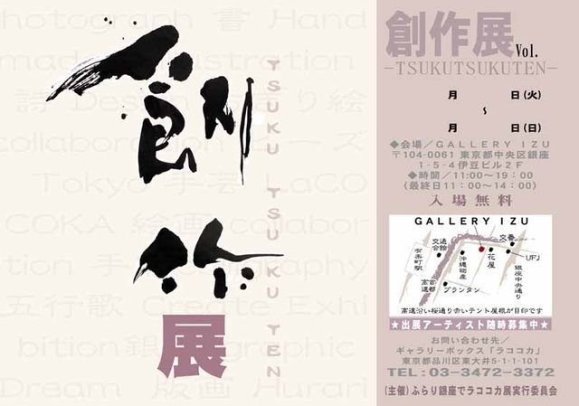 ちょっぴりおしゃれな銀座桜通り沿いのギャラリーにて… *ラココカお楽しみイベント* 創作展(TSUKUTSUKUTEN)? 「ふらり銀座でラココカ展」 <2009年12月開催 グループアート展> おかげさまでコツコツと積み重ねて参りましたグループアート展も 節目10回目の開催を迎える事になりました 今までご参加下さったアーティスト様おひとりおひとりに… また、足をお運び下さったお客様おひとりおひとりに… そして、いつもかげから支えて下さる皆様おひとりおひとりに… ココロより感謝の気持ちでいっぱいです