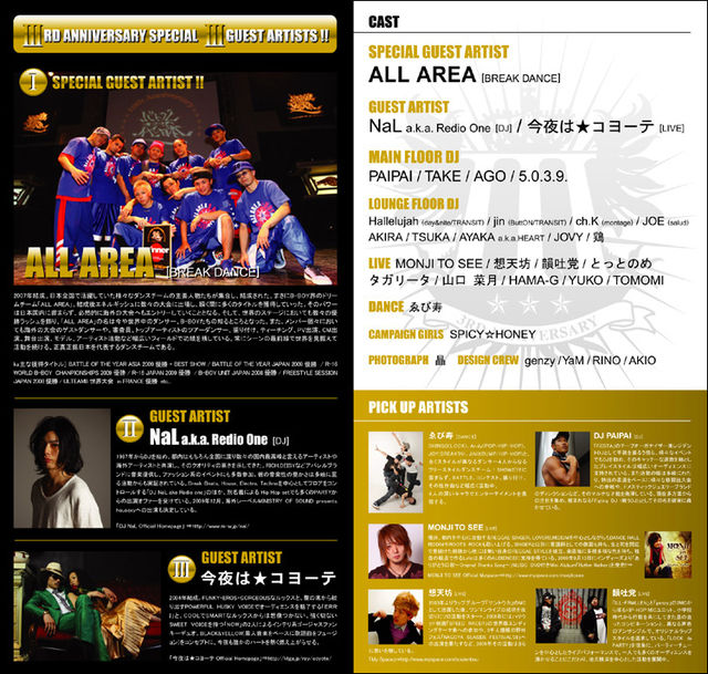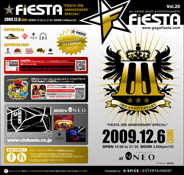 いよいよ今週日曜日!! 遂に3周年!! パチパチパチ 2009年12月6日(日) FiESTA VOL.20 " FiESTA 3RD ANNIVERSARY SPECIAL "〜 HipHop.R&B.Reggae・・etc <DATE> OPEN/15:00 CLOSE/21:30 *今回はDAYイベントの為IDチェックはありません!! DOOR/3000/1D ADV&GUEST/2000/1D 誕生日月の方は入場無料!! at:LOUNGE NEO(渋谷) (渋谷) 渋谷駅から徒歩5分 東京都渋谷区道玄坂2-21-7 第八矢澤ビル5F・6F TEL : 03-5458-2551 http://www.clubasia.co.jp CAST 【SPECIAL GUEST ARTIST】