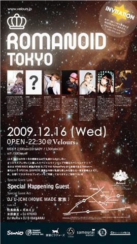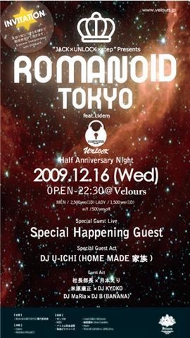 2009年12月16日[Web] “JACK×UNLOCK×step” Presents 【 ROMANOID TOKYO 】 feat.Lidem 【開催日】2009年12月16日(Wed) 【時 間】22:30 / late 【会 場】Velours (南青山) 【料 金】2,500yen(D別) w/f : 500yen-off 【SPECIAL GUEST LIVE】 ・Special Happening Guest☆ ・HOME MADE 家族“Tomorrow”リリースパーティーオープニングアクト 【SPECIAL GUEST DJ】 ・DJ U-ICHI(HOME MADE 家族) 【GUEST DJ】 ・社長部長×月本えり ・DJ MaRia