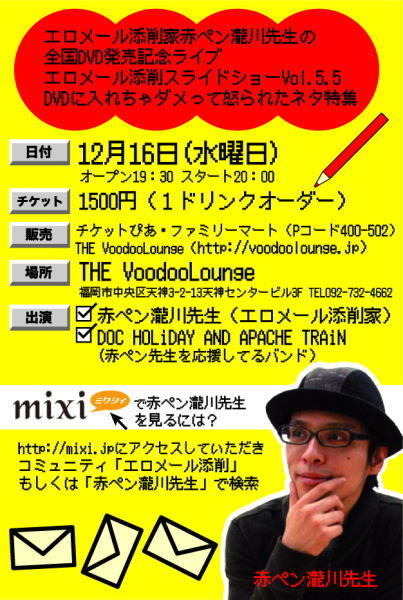 告知させていただきます。 ●公演情報● 全国DVD発売記念ライブエロメール添削スライドショーvol.5.5 DVDに入れちゃダメって怒られたネタ特集 日時:12月16日(水)open 19:30 start 20:00 場所:THE VoodooLounge(福岡市中央区天神3-2-13天神センタービル3階) 料金:1500円(1ドリンクオーダー) チケットぴあ・ファミリーマートで販売中(Pコード400-502) 私にメッセージして頂いても大丈夫です!! ●ラインナップ● ・DVDに入れちゃダメって言われたエロメールの添削 →主に具体的な芸能人の名前