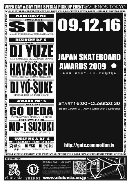 告知失礼します!! ---------------------------------------------------------------- ”クラブ業界”と”エクストリーム業界”のリアル・コラボ・イベントがブエノスで実現! ---------------------------------------------------------------- JAPAN SKATEBOARD AWARDS 2009 -第四回日本スケートボード大賞授賞式- ○主催:GATE INTERNATIONAL CO. LTD. ○協力:COMMOTION WORLD/JFSA/TWSJ/VUENOS/他 ○日時:平成21年12月16日(水) ○開場:VUENOS TOKYO(渋谷) ○時間:START:16:00/FINISH:20:00