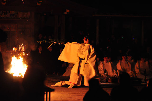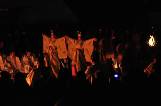 松明だけの雅な神楽ですてきです。 http://news.hachimangu.or.jp/dispdtinfo.asp?prm=&M_ID=105&C_ID=3 「宮人曲」 「人長の舞」