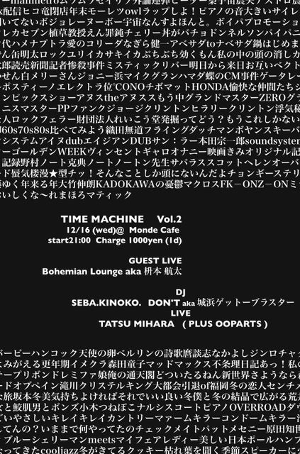 告知失礼します "time machine vol.2" 12/16 wed @ mondo cafe start 21:00 charge 1000yen(1d) ・guest live bohemian lounge aka 枡本 航太 ↓my space http://www.myspace.com/masumotokota ・djs seba kinoko don't aka 城浜ゲットーブラスター ・live tatsu mihara (plus ooparts) ↓my space http://www.myspace.com/tatsumihara
