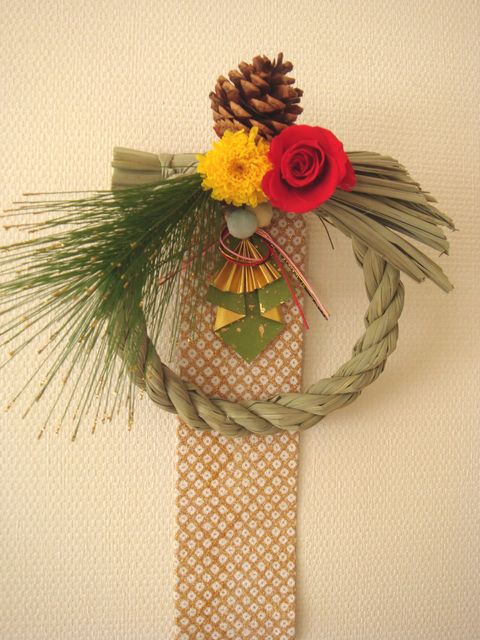 プリザーブドフラワーの講師資格を持つボチぼちと申します。 管理人こころんさんより許可を得ましてお知らせさせていただきます もう今年も残るところあと1ヶ月ちょっとですね。。 あっという間に過ぎそうですよね。 ちょっと気が早いかもしれませんが 枯れないお花,プリザーブドフラワーで和のアレンジをお正月用に 作ってみました 菊のプリザーブドフラワーに 縁起のいい松と松ぼっくりを使います。 しめ縄は年神様を迎えるために『ここより先は清浄な空間』 であることを示すためのお正月の縁起