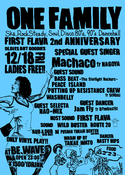 管理人様告知失礼致します。 12/18(金) ONE★FAMILY First Flava 2nd ANNIVERSARY@新宿BE−WAVE 女性入場無料!! 〜Ska,RookSteady,Soul,Disco,80's,90's Dancehall〜 今年でおかげ様で2周年を迎える事ができました。 ゲストに名古屋からMachacoさんをはじめ素晴らしいサウンドの方々を 迎えてもちろんお値段そのままに、いやお値段以上の内容でお送り致しますので 皆様、ぜひ遊びに来て下さい。 -SPECIAL GUEST SINGER- Machaco fr Nagoya http://mixi.jp/view_community.pl?id=875380 -GUEST SOUND- BASS