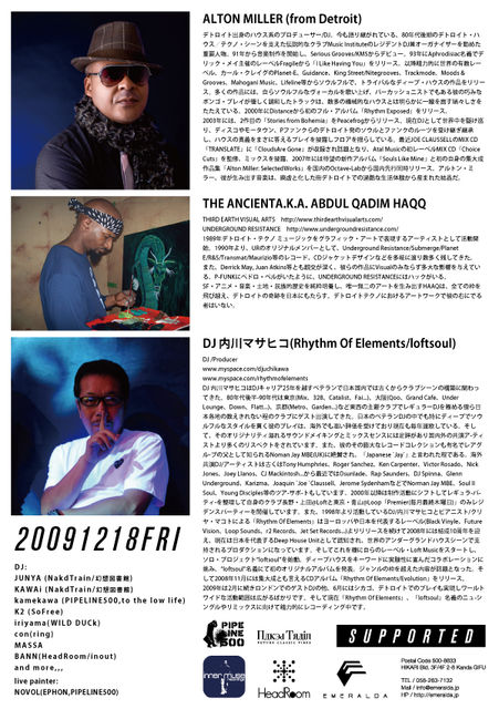 管理人様、告知失礼します。 ::::: EMERALDA :::::::::::::::::::::::::::::::::::::::::: http://emeralda.jp 岐阜市神田町2-8 ヒカリビル3F/4F tel/058-263-7132 E-mail info@emeralda.jp ::::::::::::::::::::::::::::::::::::::::::::::::::::::::::::::::::: ----------------------------------------------------------------------------------------------------------- 12/18(fir) PIPELINE500 presents alton miller&Abdul Qadim Haqq japan tour 2009 21:00~5:00 door\3500 mixiのEMERALDAコ