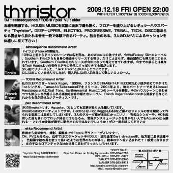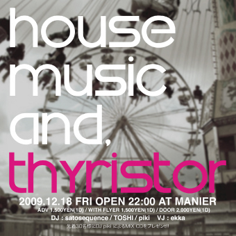 2009/12/18(FRI) "Thyristor" @ MANIER OPEN: 22:00〜 ENTRANCE FEE: WITH FLYER:1500yen(1D+MIXCD) DOOR:2000yen(1D+MIXCD) ※先着で30名様にMIXCD(mixed by piki)プレゼント! DJ : satosequence / TOSHI / piki VJ : ekka About "Thyristor"... 『五感を刺激する音』を武器に金沢のフロアーを熱く盛り上げるレギュラーハウスパーティー、"Thyristor" 。 DEEP〜UPPER、ELECTRO、PROGRESSIVE、TRIBAL、TECH、DISCO等あらゆる視点から放たれる音楽を一晩で体験できるパーティー。 Grum - Heartbea