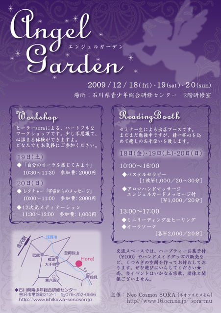金沢市で行われる12月18,19、20日のスピリチュアルイベント ”ANGEL GARDEN”にまた出店させていただくことになりました。 (注:パステル出店は18日、19日のみ) 場所は、11月5日と同じく石川県青少年総合研修センター(10時〜17時)です。 今回は、いつものように「クリスマスツリー」や「キャンドル」などの決まった題材でお客様と一緒に描く”パステル体験会”に加えて、お客様の雰囲気に合わせた絵も描かせていただこうかな? と考えていますので、興味のある方はぜひお寄りくださいね。 パステル
