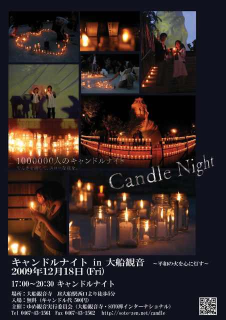 みなさまこんにちは! 12/18 大船観音でキャンドルナイトを開催いたしますので告知させてください。 普段は入ることができない夜の大船観音の幻想的でスローな夜を。 ------------------------ キャンドルナイト in 大船観音 2009 Winter 〜平和の火を心に灯す〜 2009年12月18日(Fri) 17:00〜20:30 キャンドルナイト 場所:大船観音寺 JR大船駅西口より徒歩5分 入場:無料(キャンドル代 500円) 主催:ゆめ観音実行委員会 Tel 0467-43-1561 実行副委員長(亀野)PHS 070-5551-8852 URL http://soto-ze