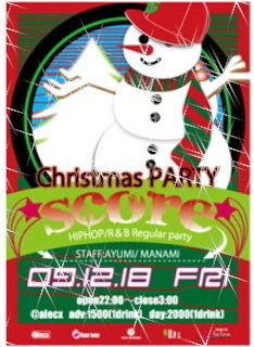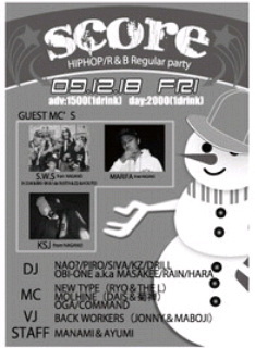 告知失礼します!!! ★SCORE★2009.12.18★X'mas PARTY★ 松本@ALECX OPEN22:00〜CLOSE3:00 ADV:1500[1DRINK] DAY:2000[1DRINK] GUEST MC's S.W.S fromNAGANO (H.D.M&BIG-SK&IdaBUSTA&Z2&HOUTO) MARIFA fromNAGANO KSJ fromNAGANO DJ NAO? SIVA KZ OBI-ONE a.k.a MASAKEE RAIN HARA MC NEWTYPE(RYO.THE L) MAR(W.S.Bee) MOLHINE OGA COMMAND VJ&Gaffer BACKWORKERS (JONNY&MABOJI) STAFF