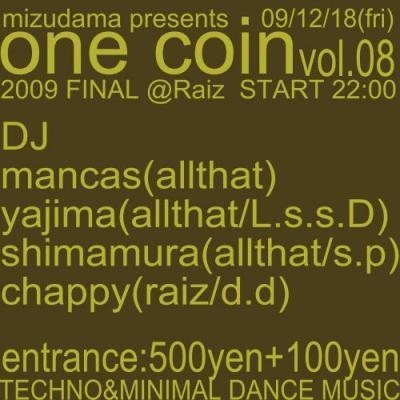 今年最後の"ONE COIN"です! 遊びに来てねー♪ 12/18(fri) [ONE COIN vol.8 2009 FINAL!!!] @ Raiz *DJ's* Yajima(ALL THAT/L.S.S.D/tb) DJNY(ALL THAT) Shimamura(ALL THAT/SOUND PROJECT) チャッピー(mizudama/Raiz) START 22:00 ENTRANCE 600YEN MUSIC:TECHNO.HOUSE