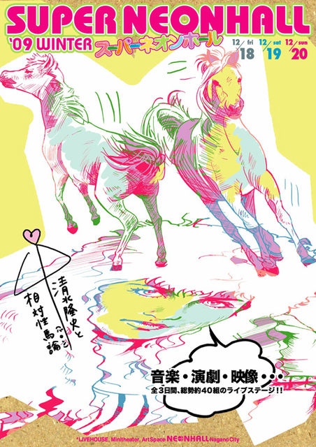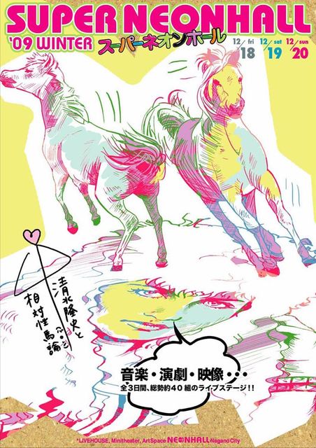 ※大橋裕之、岩井澤健治くんのアニメ「山」が長野ネオンホールで放映されます! スーパーネオンホール09冬〜清水隆史と相対性馬論(バロン)〜 12/18(金)、19(土)、20(日) ■3日間の出演者=アヲヤギツトミ(名古屋)、Qurage(山形)、lengyo(広島)、DJピロピロa.k.a.大木裕之(高知)、「山」(東京)(*アニメーション)、ミジンコ、アコースティックアンバーランド、アラケン、井原羽八夏、inco.、(う)GOKU(*朗読)、岡沢じゅん、しみずたかしと馬くん(*謎)、かじバンド、劇団13月のエレファント(*演劇)、coccas、小林武、