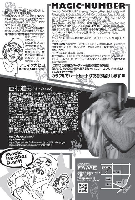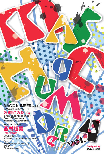 MAGICNUMBER クールなDANCEMUSICに絞ったパーリーも最高に楽しいけど ソーダの泡がはじけまくったようなひたすらポップで ぴょんぴょんとびはねてはしゃぎたくなる胸キュン系の パーリーで踊りたい!踊らせたい!という思いからスタート。 タイトルはデ・ラ・ソウルの名曲から。 BreakBeats,HOUSE,ROCK,POPを軸にしつつ オールジャンルに渡るGOODMUSICをセレクト!!! 長野市FAMEにて偶数月定期的開催中。 毎回「これだ!!!」と思ったGUESTをその時の衝動というか勢いと愛でブッキング!!! 毎夜ハズレなしと評判になってるとかいない
