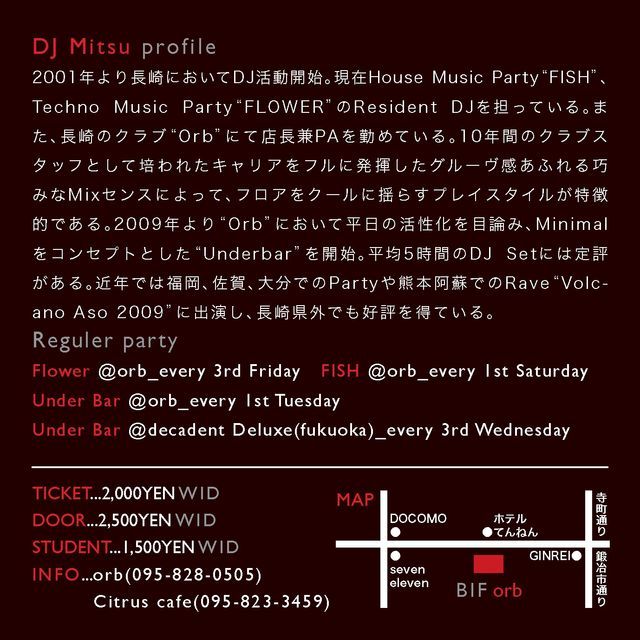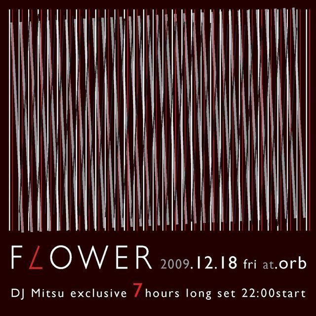 2009年最後のFLOWERは、今年を締めくくるにふさわしく、、 FLOWERのドンDJ Mitsuの7時間ロングセットです!! 時には酔いしれ、時には発狂し、時には戦い、時にはまったり、時には歓喜し、時には爆発し、、な7時間??! 終わるころには、踊りまくってみんな真っ白になってるかも。。 そしてそして、当日は《Cofe FLOWER》がOpen!! FLOWER特製ブレンドの挽きたて&入れたてコーヒーを販売します☆ バーカン&ラウンジがコーヒーの香りにつつまれ、ちょっとした癒しの空間に♫ フロアでガンガン踊れて、バーカン&ラウンジで