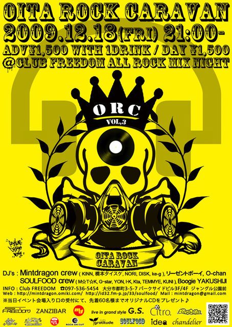 『OITA ROCK CARAVAN vol.3 〜ALL ROCK MIX NIGHT〜』 2009.12.18(fri) @Club FREEDOM Start 21:00 ADV:1,500yen with 1drink / DAY:1,500yen ※当日イベント会場入り口の受付にて、先着60名様までオリジナルCDをプレゼント♪ DJ's... “mintdragon crew”(KINN, 橋本タイスケ, NORI, DISK, ke-g) “SOULFOOD crew”(M☆T☆K, YON, G-star, KUNI, I・K, Kta, TEMMYE) リーゼントボーイ O-chan(3.2.3) Boogie YAKUSHIJI INFO : Club FREEDOM & 097-536-5454 大分市都町3-5-7 パークサイドビル3F/4F ジャングル公園前 Web