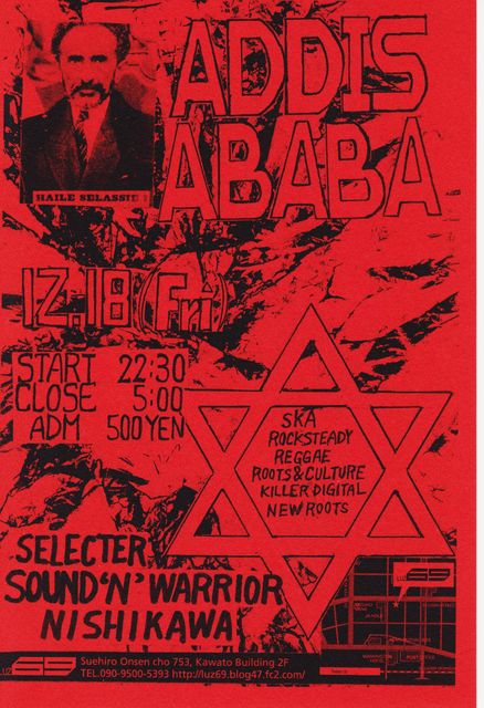 ADDIS ABABA GENRE:SKA/ROCKSTEADY/REGGAE ■2009/12/18 fri ■OPEN 21:00- ■@LUZ69 ■DJ:SOUND NISHIKAWA "N"WARRIOR ■DOOR:\500 ☆金曜日を借り切ってのスペシャル!!! NISHIKAWA 気合入ってます♪