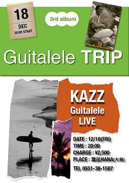 KAZZ Guitalele TRIP in 八ヶ岳 日時:12月18日(金) 20:00〜 場所:葉凪-HANA- (山梨県北杜市大泉町) 申込:0551-38-1587 チャージ:\2,500 KAZZファンの皆様、美味しい料理とともにKAZZ時間をゆるゆると 過ごしませんか? お待ちしております〜。