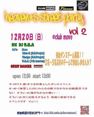 heaven's street party 第2弾決定!! 日時:12月20日 日曜日 場所:@club move open 12:30 start 13:00 キッズorジュニア(18歳)までをターゲットにしたダンスイベント せっかく 練習したのにみんなの前でお披露目できない そういった場がなかなか無い・・・ そういった方にお答えするよう 気軽に参加できる 場を提供していきたいと思います 先着20組限定!!! ★エントリー費★ 1人→2000円(別途1ドリンク 500円) ★チケット★ 前売り→1500円(別途1ドリンク 500円) 当日券→2000円(別途1ドリンク 500円)
