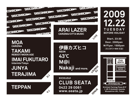 10月に吉祥寺にオープンしたばかりのCLUB SEATAにて、 MOA(CARIZMA)を中心とした新パーティー「DISCOHACK」がスタート!! その第2弾となる今回はTAKAMI(REBOOT/MOON AGE) 、IMAI FUKUTARO(Intermix/Tokyo)、 ライブにはARAI LAZER(CARIZMA/CITTA MUSIC) に向かえて開催! 音楽とお酒を気軽に楽しめるこのパーティーにぜひ! --------------------------------------- DISCOHACK 2009.12.22(火・祝前日) start 23:30- at 吉祥寺CLUB SEATA ■DJ MOA(CARIZMA) TAKAMI(REBOOT/MOON AGE) IMAI FUKUTARO(Intermix/Tokyo) JUNYA TE