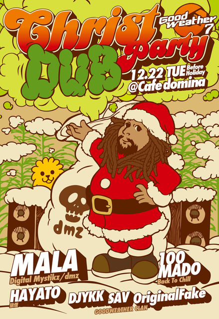晴れGOOD WEATHER7晴れ クリスマス"CristDUB PARTY" with MALA(form DMZ)クリスマス 2009.12/22 (Tue) @ cafe domina 名古屋、栄4丁目 OPEN 22:00 ADV 2000yen DOOR 2,500yen INFORMATION http://www.cafe-domina.com/ SPECIAL GUEST MALA-DIGITAL MYSTIKZ(DMZ/Deep Medi Musik/UK) GUEST DJ100mado (from Back to Chill) HAYATO (from狼煙) GOOD WEATHER CLAN DJYKK SAV Original Fake ”HOME SWEET HOME" 聖なる夜を迎えましょう GOOD WEATHERのルーツポジション ベースの福音鳴り響く、サウスロンドンから名古屋へ