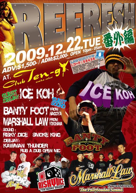 -REFRESH番外編- 堺 Club Ten-g 堺市大浜西町23 J&Yビル2F TEL:072-238-2266 MAP ■GUEST DEE JAY≫ ICE-KOH ■GUEST SOUND≫ BANTY FOOT from 名古屋 / MARSHALL LAW from 横浜 ■HOST SOUND≫ RISKY DICE-the deadly sound- / SMOKE KING ■DEE JAY≫ KAWMAN THUNDER ■Rub a dub open mic! 9pm-5am ADV.\1500 ADM.\2000 ※別途、入場時にドリンク代を頂きます [チケット] ローソン TEL:0570-084-005 (L:58436) / ROCKERS ISLAND / DISSIDENT / NESTA BRAND OSAKA / ESP TRICK STAR / FROG