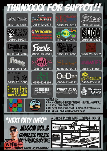 Wipe×JALGOW コラボパーチィー 2009/12/22(TUE) @Dazzle Puzzle 22:00START!!!!! SPECIAL GUEST DJ SANKON HUMAN BEAT BOXER DJ AFRA -GUEST DJ- DJ U-GEE(Wipe) DJ HIDEKO(Wipe) DJ YU-KI(葉港GROUND) -GUEST MC- EXTENDED 田中 達也(ENERGY REC.) -GUEST SINGER- 聖香(Wipe) -GUEST LIVE- カッシー -GUEST DANCER- adore