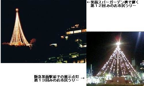 『みのお市民ツリー 協賛金ご協力のお願い』 いよいよシーズンがやって参りました 箕面商工会議所青年部では、平成8年以来、市民参加型の交流イベントとして 『広げよう市民の輪、灯そう愛の火を』をテーマに『みのお市民ツリー』を実施してきました。 この『みのお市民ツリー』は、12月23日(水曜祝日)〜25日(金曜日)の3日間 高さ50mにもおよぶ巨大なクリスマスツリーを電飾で設置するもので、 平成8年の第1回から昨年で13回目を迎えることができました。 旧来、箕面山の中腹にに設置していましたが、昨年は諸