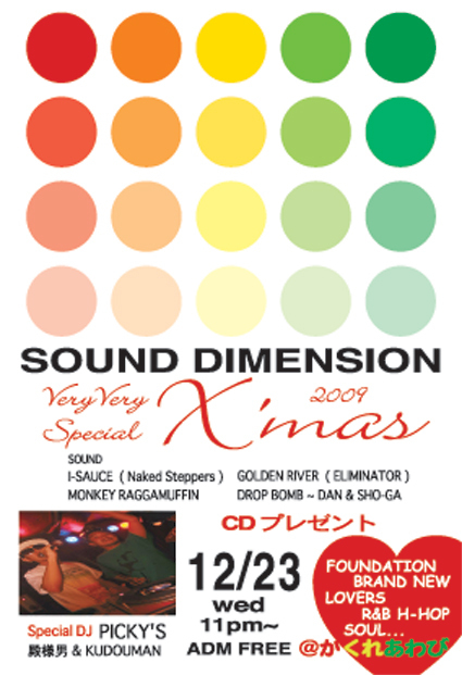 SOUND DIMENSION 〜VeryVery X'mas Special〜 Guest PICKY'S (KUDOUMAN & TONOSAMAN ) CD プレゼント!!! 11PM〜 ADM FREE ■■■ SOUND DIMENSION ■■■ I-SAUCE (Naked Steppers ) Golden River (ELIMINATOR / SOUND DRIVE ) Monkey Raggamuffin ( SOUND DRIVE ) DROP BOMB (DAN & SHOW-GA) ヨロシクお願いします!!!
