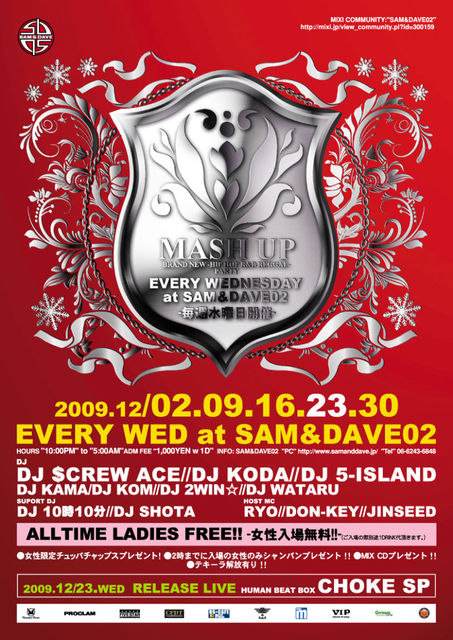 マッシュアップCM動画: 大阪の水曜日のPARTYは もはや定番のマッシュアップ http://ameblo.jp/mash-up-osaka/ party photoはblogに毎週upしてます^^ X'Mas、年末に向けてマチガイナイCLUB DJ TIMEで楽しみたいなら 初めての方も楽しめる空間サムアンドデイブツーの水曜日 ”マッシュアップ” かかる曲はHiphop R&Bの新旧定番曲 レディースフリー(drink代500yenのみ別途) 男性は1000yenワンドリンク 女性も男性もキャッシャーにて 『ワタルのゲストで』と言ってクダサイ☆ DJには、国内クラブは