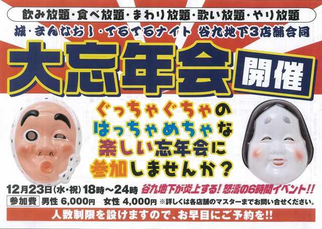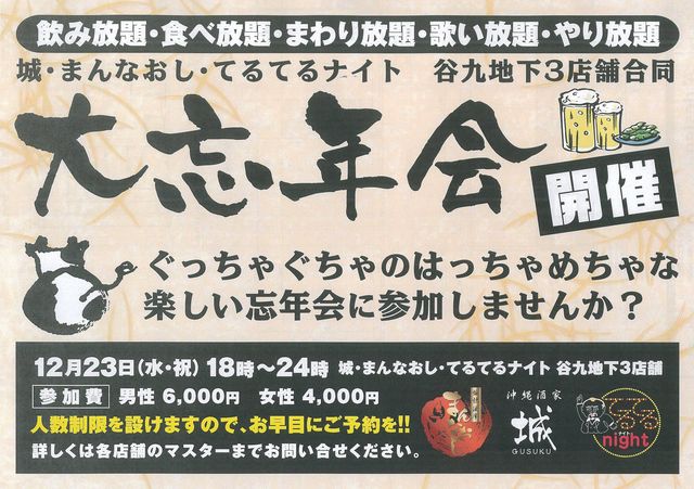 お待ちかね とうとう谷9地下での 選ばれし者達の忘年会 が 開催されます 今年はなんと3店舗合同協賛による開催ということで 御1様一定の金額にて 3店舗 ★グスク ★まんなおし ★テルテルナイト を好きなだけハシゴ食べ歩きできる ・・・という企画です って事で皆さん沢山の参加をお待ちしてます