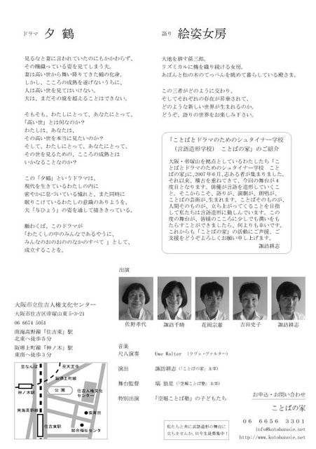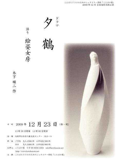 管理人さま、わたくしどもの大阪での12月の語り・お芝居の公演のお知らせをいたしたく、 スペースを使わせていただきます。いつもありがとうございます。 「ことばの家」第4回言語造形公演 『ドラマ 夕鶴』 『語り 絵姿女房』 http://www.kotobanoie.net/yuzuru.html ドラマ『夕鶴』 語り『絵姿女房』 (木下順二作) 2008年12月23日(水・祝) 開場13:30 開演14:00 終演16:30予定 大阪市立住吉人権文化センター 1F 大ホール (tel 06-