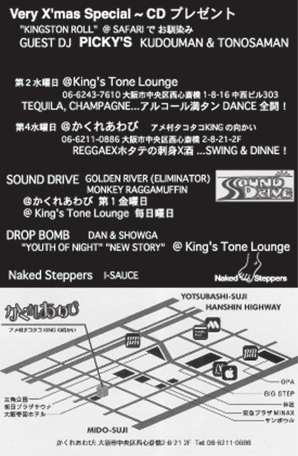 告知お願い致します。 SOUND DIMENSION 〜VeryVery X'mas Special〜 Guest PICKY'S (KUDOUMAN & TONOSAMAN ) CD プレゼント!!! 11PM〜 ADM FREE ■■■ SOUND DIMENSION ■■■ http://mixi.jp/view_community.pl?id=2277230 I-SAUCE (Naked Steppers ) Golden River (ELIMINATOR / SOUND DRIVE ) Monkey Raggamuffin ( SOUND DRIVE ) http://mixi.jp/view_community.pl?id=3226869 DROP BOMB (DAN & SHOW-GA) @かくれあわび 大阪市中央区西心斎橋 2−8−21 2F 06−6211−0
