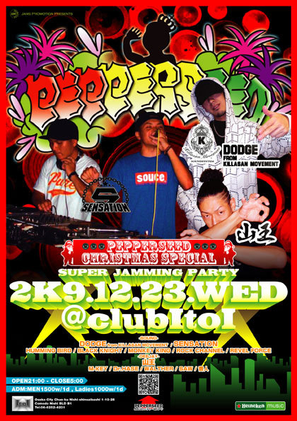 第2木曜日のItoIといえば「PEPPER SEED」。 今回、12/23にXmas SPECIALとして緊急開催!! 〜SOUND〜 DODGE From KILLASAN MOVEMENT SENSATION HUMMING BIRD BLACK KNIGHT MONKEY KING ROCK CHANNEL REBEL FORCE 〜DEEJAY〜 山王 M-KEY Dr.HASE WALTHER SAW 音人 若手を中心とし、勢い有り余るSOUND、DEEJAY、DANCERが間違いない一夜をお届けする大好評のSUPER JAMMING PARTY!!! 毎回のSHOW CASEやRUB A DUBが見物!! もちろんSOUND PLAYではVIBES上がりっぱなしのAL