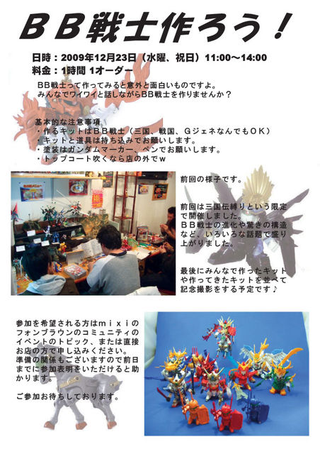 先月、BB戦士三国伝を作ろうというイベントをさせていただきました。 で、やってみたら意外と面白いなということで 今回、BB戦士ならなんでもOKという形でやろうと考えてます。 日時は2009年12月23日(水曜、祝日)の 11:00〜14:00を予定しております。 料金に関しては通常のオフ会同様ということで 1時間1オーダーという形を採用しようと思っております。 (参加人数によっては別プランも・・・とマスターと相談してます) 基本的な部分は前回同様ということでお願いします。 ・作るキットはBB戦士(三国、戦国、Gジェネな
