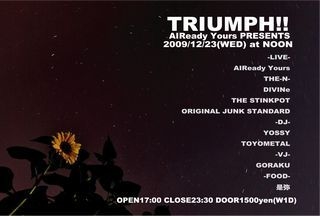 2009.12.23(wed) -AlReady Yours presents- 『TRIUMPH!!』 NOON http://www.noon-web.com/what.html 大阪市北区中崎西3-3-8 JR京都線高架下 OPEN 17:00 / CLOSE 23:30 DOOR 1500yen(W1D) -LIVE- AlReady Yours THE-N- DIVINe THE STINKPOT ORIGINAL JUNK STANDARD -DJ- YOSSY(FUNNY RADIO) TOYOMETAL(METAL NIGHT) -GUEST DJ- K∞SUKE(NASTY RECORDS) -VJ- GORAKU -FOOD- 是弥(もつカレー) -イエガーガール- RIE