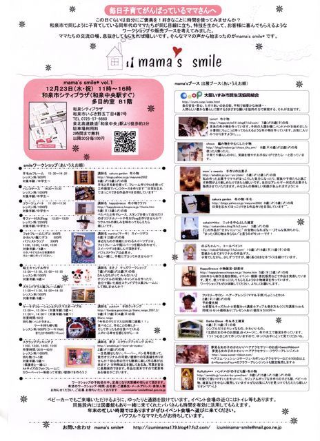 mama's smile* vol.1 日時:2009年12月23日(祝・水) 11:00〜16:00 場所:和泉シティプラザ 多目的室&調理室 最寄の駅:泉北高速鉄道「和泉中央駅」下車すぐ mama's smile*ブログ→http://izumimama179.blog47.fc2.com/