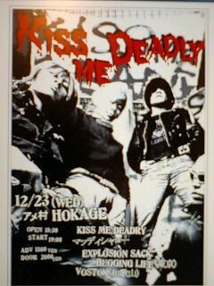 お待たせしました〜 『kiss me deadly 』 半年ぶりのライブです 《メンバー紹介》 ・Kitao / Vo. Gui ・Yoshinaga / Gui ・Tai / Bass ・Maki / Dru 〔出演バンド・時間〕 ◎マッディシャロー 19:00〜 ◎VOSTOK 19:35〜 ◎KISS ME DEADLY 20:10〜 ◎BUGGING LIFE 20:45〜 ◎EXPLOSION SACK 21:20〜 ADV:\1500 DOR:\2000 是非是非、見に来て下さいね