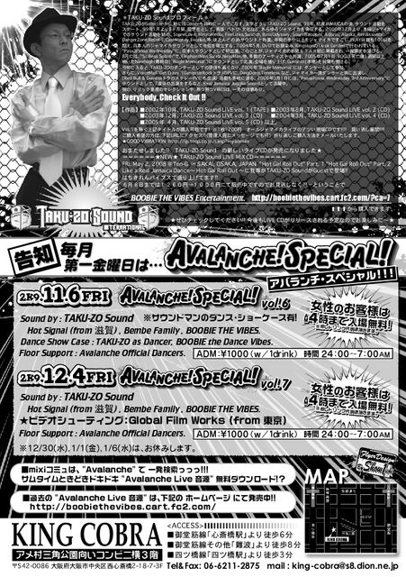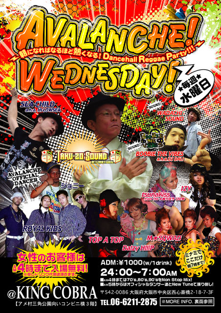 管理人様、告知させて頂きましてありがとうございます^^ 毎週水曜日開催 "AVALANCHE WEDNESDAY" (アバランチ・ウエンズデー)!! -朝になればなるほど熱くなるDancehall Reggae Party- 4時までは70's,80's,90'sをNon Stop Mix! 5時からはオフィシャルダンサー達とNew Tuneで踊り倒し! ミナミでここだけ朝7時まで! ※2009年12/30(水)と、2010年1/6(水)は、お休み!! 毎月第1金曜日開催 "AVALANCHE SPECIAL" (アバランチ・スペシャル)!! -朝になればなるほど熱くなるDancehall Reggae Part